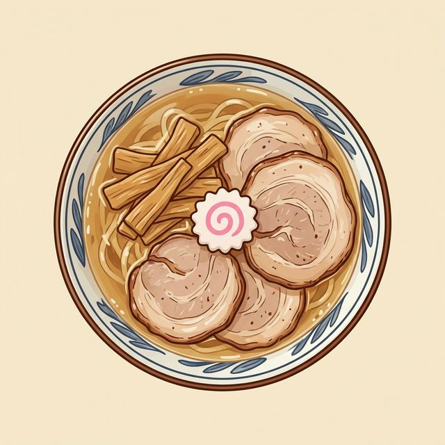 - スープと寄り添う「中細ちぢれ麺」 : 喉越しの良い中細麺が、黄金色のスープをしっかりと持ち上げます。トッピングのチャーシューやメンマ、そして彩りを添えるナルトまで、すべてが伝統的な「支那そば」の美学を体現しています。
