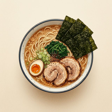 - 濃厚な豚骨ベースのスープに、パンチの効いた醤油、またはマイルドな塩から味を選べるスタイル。