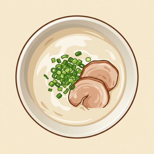 - 豚骨と水のみを長時間徹底的に煮込み、毎日麺との相性を考慮して仕上げる秘伝の濃厚スープ。